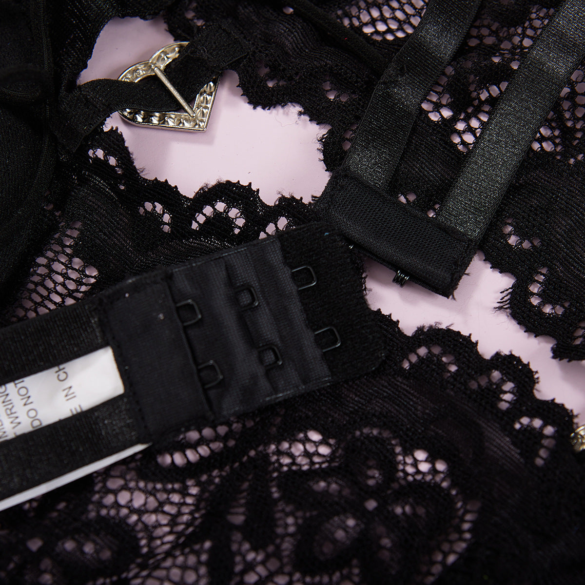 Dare to captivate in this ravishing black lingerie set, designed to showcase your curves from every angle. The bold strappy back creates a striking visual effect—framing your silhouette with sleek lines and irresistible tension.